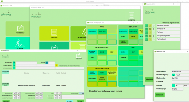 De software is verkrijgbaar in een beheerversie, een medewerkersversie en een mobiele versie. Binnen deze versies werkt Timin' Systems met tegels, onder andere de urenbrieftegel, de medewerkerstegel, de factuurtegel, de offertetegel en de klantentegel. Het team van Timin' Systems levert een Nas-server met een database en installeert Timin' Systems op de pc. Het team geeft een maand lang opstartondersteuning en optioneel ondersteuning gedurende het hele jaar. De Boer: 'Als je een eenmanszaak hebt, is een medewerkersversie niet nodig. Je kunt dan toe met een beheerversie, want je hoeft alleen 's avonds je eigen urenbriefje in te vullen. De beheerversie kun je natuurlijk uitbreiden met de mobiele versie en/of de medewerkersversie.' De kleine hovenier met medewerkers heeft in elk geval een medewerkersversie nodig. Met de mobiele versie kunnen de medewerkers onderweg eenvoudig hun urenbriefje invullen op een tablet en ook de gebruikte machines, materialen en werkzaamheden laten invullen.