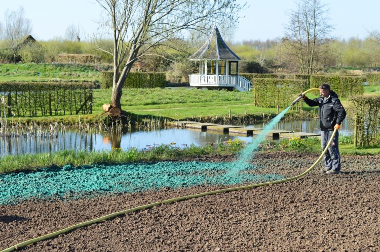 Flexterra zorgt er voor dat het zaad (1 gram per m2) goed verdeeld wordt en dat het beschermd kan gaan kiemen. In twee weken is de groene kleur verdwenen en zullen de eerste plantjes door het laagje heen gaan breken. Voor het 'inzaaien' is de onkruid vegetatie verwijderd en heeft DCM de voedingswaarde op peil gebracht. De wonderborders van Jan-Hein en Jaap zouden Nederland wel eens heel bloemrijk kunnen gaan maken.