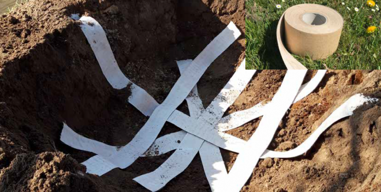 RootBarrier - Watertapes De RootBarrier Watertape is een 100% biologisch afbreekbaar tape op basis van jute, voorzien vanveen eenzijdige 100% biologisch afbreekbare coating met een gewicht van 240 g/m². Deze coating bestaat uit een superabsorber en een bindmiddel. Door invloed van water lost de superabsorber langzaam op van de tape en migreren de geldeeltjes in de omliggende grond.