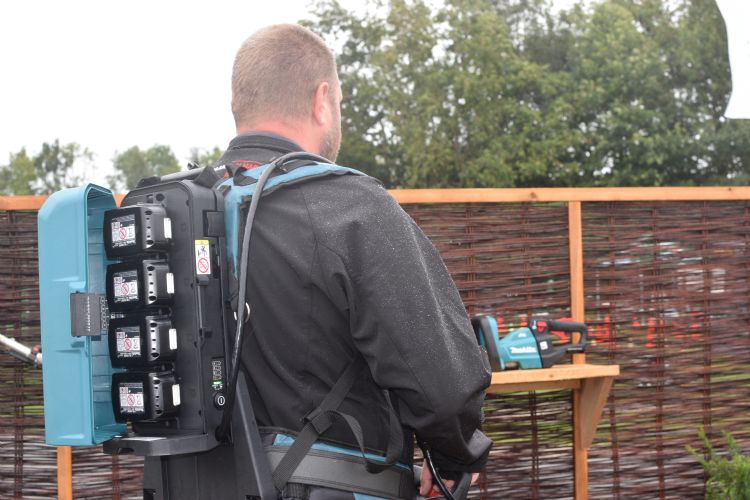 Dit brengt ons direct op het derde product, gloednieuw gearriveerd uit Oostenrijk: het ruggedragen accustation van Makita. In dit accustation gaan vier losse Makita-accu's, zoals je ze kunt vinden in ieder Makita-accugereedschap. Volgens Moniek van de Coevering van Makita heeft dit als grote voordeel dat wanneer er een accucel kapot is je slechts één accu á 95 euro hoeft te vervangen. Je hoeft hierdoor niet langer de hele ruggedragen accu te vervangen. Daarnaast kost het nieuwe ruggedragen accustation 860 euro inclusief vier accu's, exclusief btw. Dit maakt hem significant goedkoper dan de ruggedragen accu's van andere merken waarbij je al gauw uitkomt op zo'n 1200 á 1300 euro. Kortom een fijne ontwikkeling voor hoveniers die op de kleintjes letten.