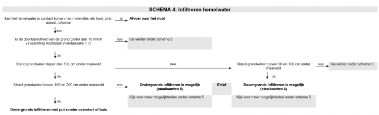 Het doel van het afstudeerproject dat Van der Meijden deed samen met twee studiegenoten, was om het aantal overstorten van de riolering door overmatig regenwater in het oppervlaktewater te beperken. Van der Meijden: 'We zijn gaan uitzoeken hoe vaak het riool overstort naar het oppervlaktewater, en of die frequentie verlaagd kan worden als particulieren het hemelwater afkoppelen van de riolering. Ik deed onder andere inspiratie op in België, waar ze al veel verder waren op dit gebied. We hebben berekend hoeveel water er vrijkomt bij een stevige hoosbui en we kwamen erachter welke mogelijkheden er zijn om dat water zo lang mogelijk vast te houden in de tuin. Het blijkt wel degelijk mogelijk te zijn om het aantal overstorten te reduceren door af te koppelen. Om de mogelijkheden te laten zien, hebben we destijds een ideeënboek samengesteld.' Aan de hand van de 'beslisboom hemelwater' kun je vragen beantwoorden waaruit blijkt wat er mogelijk is in jouw tuin. Is het dak van zink, dan zijn er minder mogelijkheden. Bij dakpannen of kunststof dakbedekking zijn er wél mogelijkheden. Door de vragen van de beslisboom in het handboek te doorlopen, komen er ideeën naar voren die voor elke tuin weer anders zijn. 'Woon je bijvoorbeeld in Brabant, dan komt eruit rollen dat je in de bodem kan infiltreren. De zandgrond in dat gebied laat het water goed door. In een gebied met kleigrond is het beter om water op te slaan in bijvoorbeeld een schutting of een vijver.'