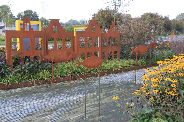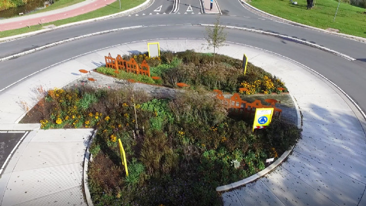 Vakblad De Hovenier ging dit jaar voor de tweede keer op zoek naar de mooiste rotonde van Nederland en we hebben een winnaar! Een jaar lang draagt de rotonde Het Wonder van Woerden de titel Mooiste Rotonde van Nederland. Edo Post Uiterweer, directeur van De Aar Hoveniers uit Woerden, kreeg de trofee voor de Mooiste Rotonde 2019 op donderdag 17 oktober uit handen van Linde Kruese (redacteur De Hovenier). De rotonde van De Aar Hoveniers vertelt de legende 'Het Wonder van Woerden', waarin tijdens de belegering van de Spanjaarden een hongersnood werd afgewend door de komst van een grote hoeveelheid vissen die via de Oude Rijn de stad binnenzwommen. Dwars over de rotonde is met blauw-grijze rijntjes de rivier weergegeven, waarboven een aantal cortenstalen vissen 'zwemmen' in de richting van de stad. De rijntjes zijn zowel een verwijzing naar de rivier de Oude Rijn als naar de baksteen- en dakpanindustrie van Woerden. Het ontwerp is gemaakt door Angela Warmerdam van Ontwerpstudio Angela's Tuinen uit Lisse. Warmerdam: 'Het verhaal het wonder van Woerden leent zich ervoor om op de rotonde doorverteld te worden. In eerste instantie had ik houten 3D-huizen ontworpen die dienden als insectenhotels, maar omdat hout niet zo bestendig is, kozen we toch voor cortenstalen huizen. De cortenstalen rand langs de stenen rivier staat voor de kademuur. Ook de kleuren van het gemeentewapen komen terug in de beplanting. We hebben veel geel gebruikt.' Het wapen bestaat uit twee gouden leeuwen die een schild vasthouden met daarop een gouden kroon.
