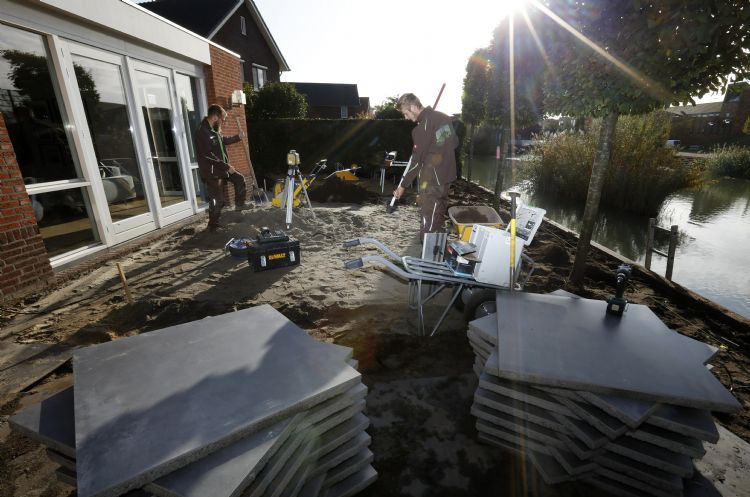 We spreken Den Engelse op locatie bij een klus in Beuningen. Hij legt daar een nieuwe tuin aan bij een mooi vrijstaand huis aan het water. De oude tuin is ten tijde van de bouw van het huis aangelegd; de bewoners willen nu wat anders. Den Engelse: 'Na verloop van tijd raak je uitgekeken of ga je de tuin anders gebruiken. Het huidige ontwerp sluit aan op de huidige wensen.' Direct aan het water stonden veel planten, waardoor je in de tuin een opgesloten gevoel had. Ook leek de tuin daardoor heel ondiep. Daar moest wat aan gedaan worden. 'De bewoners wilden weinig inkijk van de huizen aan de overkant van het water. Daarom hebben we de bomen laten staan en andere beplanting weggehaald; daar zijn siergrassen voor in de plaats gekomen. Het terras was in verhouding groot voor de tuin, dus dit wordt flink verkleind. Daar komen gras en beplanting voor in de plaats. Aan de zijkant van het huis gaan we een zwevende vlonder plaatsen. Aan de andere kant komen verhoogde, wit gestucte bloembakken.' Den Engelse heeft bij het ontwerp geluisterd naar de wensen van de klant. 'Ik kijk hoe dat past in het geheel en voeg er eventueel dingen aan toe. Dit is een supermooie klus, met alles erop en eraan: geautomatiseerde verlichting, beregening en een robotmaaier die via een app te bedienen zijn.'