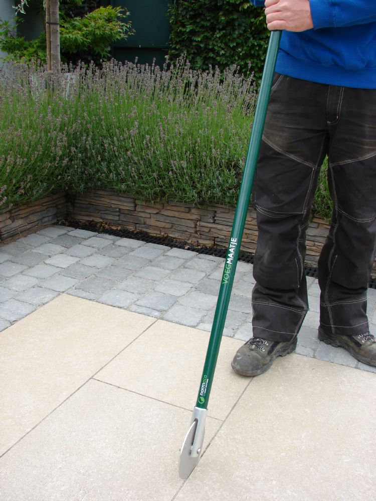 Een ander aandachtspunt, volgens Weijers: 'Aqua XP zal bij een gebakken steen moeilijker onderin komen, zeker als er niet met het voegmaatje kan worden nagerold. In dat geval kan het beter zijn om met StoneFlex te werken, omdat dit gemakkelijk in de voegen loopt. Zet wel altijd een proef op bij een geheel droog steenoppervlak.' Weijers verklaart de term 'voegmaatje': 'Dit hebben we in 2015 geïntroduceerd. Het is een handig stuk gereedschap met verwisselbare rvs-schijven (1 t/m 6 mm) om het voegmateriaal in de voegen aan te drukken en te rollen. Je hoeft als hovenier niet eens zelf te drukken, want het voegmaatje weegt 7 tot 8 kg en geeft dus al voldoende druk aan de voeg. Hierdoor komt de voeg echt helemaal onderin. Je kunt het gebruiken bij alle soorten waterdoorlatende voegproducten. Hierdoor hoef je de tegels niet te trillen en kun je snel werken. Om de hovenier van nog meer gemak te voorzien, komen we in 2020 met het hulpmiddel Twizzie; daarmee kun je makkelijk een tuinslang en sproeikop vastmaken op een trekker of bezem. Je kunt de sproeikop er ook in draaien, zodat je in alle richtingen water kunt spuiten. Hierdoor heb je een man minder nodig om Aqua XP goed te verwerken en bespaar je veel geld op de uren.'