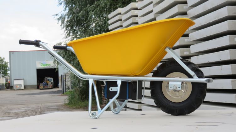Lambregts vervolgt: 'De accu met bijbehorende elektronica van de E-PowerBarrow tref je aan in een slede onder de bak. Ongeacht of je een kruiwagen hebt met AGM-loodaccu of lithiumionaccu is de accu verwisselbaar en met de 2,5 Ah snellader binnen vier uur helemaal opgeladen. De kruiwagen werkt met een 24 V hubmotor, heeft een vermogen van 430 W, een koppel van 130 Nm en drijft een zogenoemd Chevron-tractiewiel met ribprofiel aan. Dit wiel is ervoor gemaakt om ook door mul zand en modder te rijden zonder te slippen. De band is geproduceerd uit pak-vrij materiaal en REACH-gecertificeerd. Dankzij de IP54-constructie is het geheel stof- en spatwaterdicht. De kruiwagen kan dus optioneel worden uitgerust met supportwielen, onder meer vol schuim-, luchtband- en Flex-Lite antilekwielen. Ook die zijn allemaal pak-vrij en REACH-gecertificeerd.' De draagkracht van de kruiwagen bedraagt maximaal 150 kg en hij kan voor van alles gebruikt worden, van zand en aarde tot grind en klinkers.