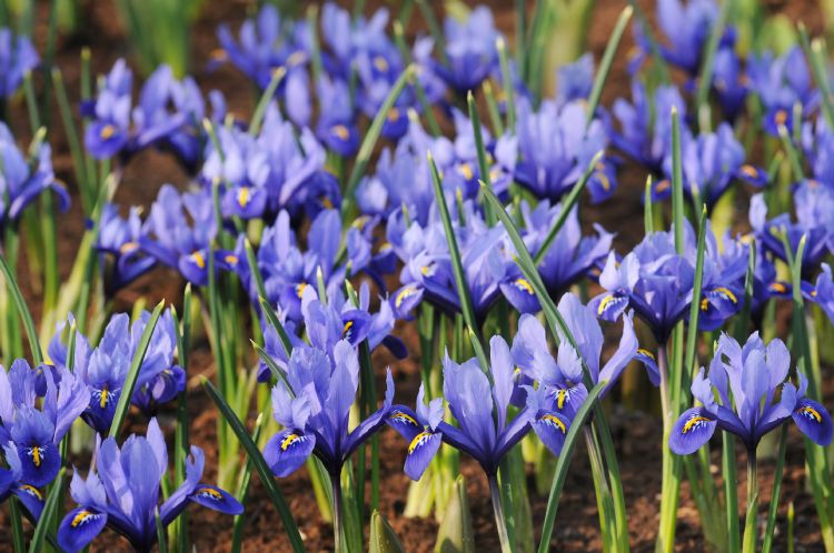 In februari zie je de eerste kleine irisjes bloeien: Iris reticulata. Ook hiervan zijn veel cultivars, in de kleuren paars, blauw, hemelsblauw en wit. Mooie cultivars zijn 'Clairette', 'Harmony', 'Pixie' en de witte 'Natascha'. Je hebt wel wat mooi weer nodig en een beschutte plek tegen een muur of tussen het grind; dan kun je hele plakkaten van kleur verwachten.