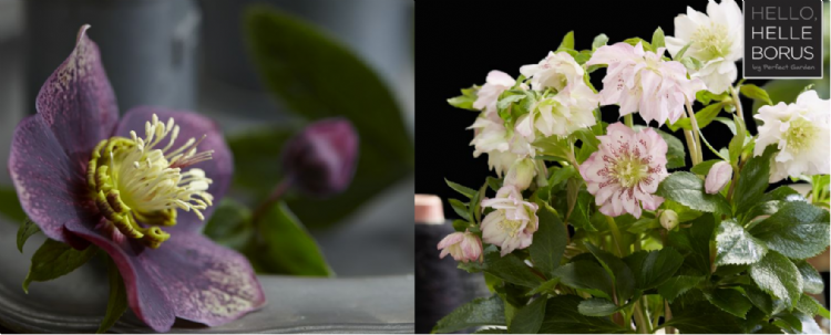 | | H. orientalis (links) 'Double Ellen Pink valt op door de mooie dubbele roze bloemen op lange stelen & H. orientalis 'Hello Ruby' heeft dieppaarse bloemen.. |