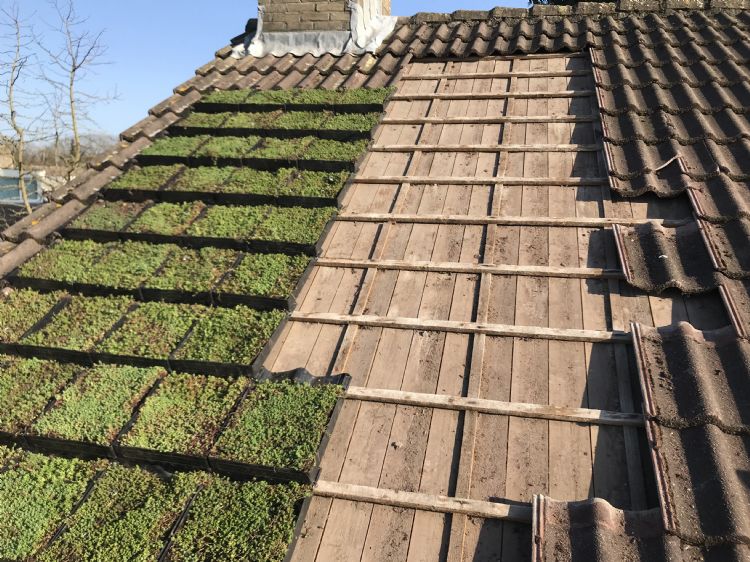 Eerder schreven wij dat er voor hoveniers een wereld van kansen openligt als ze het dak op durven. Van Helvoirt Groenprojecten is zo'n bedrijf dat het dak op gaat. Zij maken geregeld de mooiste daktuinen met ingenieuze retentiesystemen en plaatsen deze projecten op hun socialmediapagina's. Het LinkedIn-bericht over de groendakpannen werd bijna 10.000 keer geliked en kreeg meer dan 700 reacties. Akkersmans: 'Wij waren helemaal overdonderd. We plaatsen regelmatig berichten over de mooiste daktuinen met slimme systemen en nu gaat deze simpele dakpan helemaal viral!' Toch zit er volgens Akkermans wel een leuk verhaal achter. 'De opdracht voor het vergroenen van een dak van een rijtjeshuis kwam van een mevrouw van middelbare leeftijd. Zij wilde graag verduurzamen en nam contact met ons op. Wij doen veel in groene daken en leggen ze regelmatig aan, maar hadden nog geen ervaring met het vergroenen van schuine daken. Deze mevrouw kwam uiteindelijk zelf met het idee van de groendakpan.'
