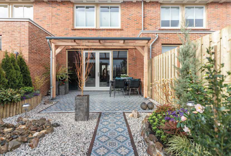 Genieten in een tuin vol zitcomfort, bloemen, planten en watermanagement