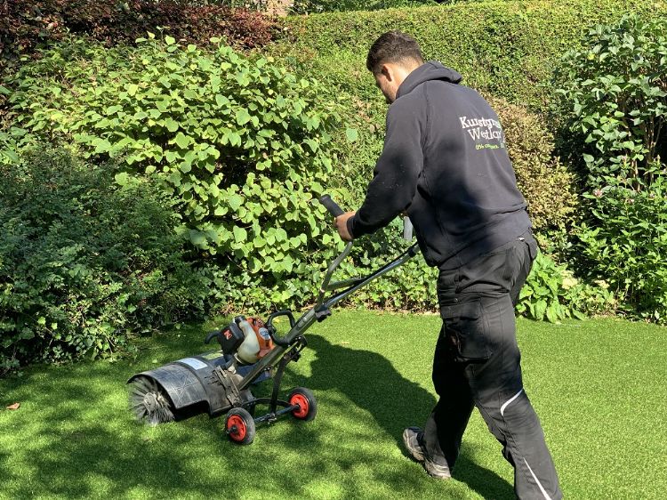 Tot slot wordt het veldje geborsteld. Zo komen alle haren mooi omhoog te staan. Het borstelen gebeurt met een Stihl MM55-borstelmachine. Er wordt geen zand ingeveegd voor verzwaring of om de haren beter omhoog te laten staan; de nadelen van zand invegen zijn namelijk groter dan de voordelen. Van der Hout: 'De mosdraad in deze types kunstgras zorgt ervoor dat het kunstgras mooi overeind blijft staan. Zand invegen heeft vaak alleen maar als gevolg dat er sneller onkruid en mos in het kunstgras komen. De kwaliteit van dit gras is goed.'
