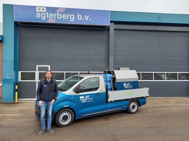 Matthijs Agterberg met een van de heetwater-onkruidbestrijdingsmachines op een pick-up geplaatst. Het bedrijf heeft besloten over te stappen op elektrische pick-ups.
