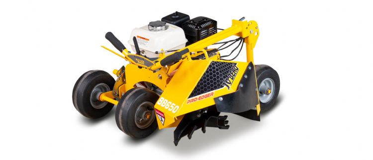 De machine, die 72 kilo weegt, laat zich samen met alle benodigde onderdelen gemakkelijk meenemen in de werkbus en zelfs in de kofferruimte van een gezinsauto. Met ingeklapte stuurboom is de totale lengte 760 mm, zodat deze kantensnijder ook in de loods weinig ruimte inneemt. Aan de stuurboom zitten twee hendels: één om gas te geven en één om de machine in het werk te zetten. Dit gebeurt door de vergrendeling van de voorwielen op te heffen. De diepte-instelling gebeurt bij die voorwielen. Daarbij staat één wiel uiteraard niet in lijn met de achterwielen, zodat je niet door de losgefreesde bordergrond rijdt. Plooij zegt hierover: 'De machine heeft achter zwenkwielen. Hij staat op brede luchtbanden. Mede door de kleinere wielafstand aan de voorkant laat hij zich gemakkelijk sturen en is hij zeer wendbaar. Je kunt die zwenkwielen in de lengterichting van de machine overigens blokkeren, zodat je in een perfecte rechte lijn kunt werken. Wat de instellingen betreft: zowel de stuurboom als het snij-freesgedeelte is in hoogte, respectievelijk diepte instelbaar. Beide soorten frees-/snijwielen hebben dus een doorsnede van 400 mm; ze zijn zeer robuust en hebben een maximale werkdiepte van 10 cm. Qua uiterlijk verschillen de BB650 en BB650+ dus vooral door de veel bredere beschermkap die de eerste heeft, vanwege de bredere meswerking. De BB650+ kun je ook herkennen aan de kabelkit die er eventueel op gemonteerd is. Er is een Honda GX270- eencilinder-viertaktbenzinemotor op de machine gemonteerd. Deze heeft een vermogen van 5,5 pk. Het geluidsniveau hiervan ligt op 100 dB(A).'