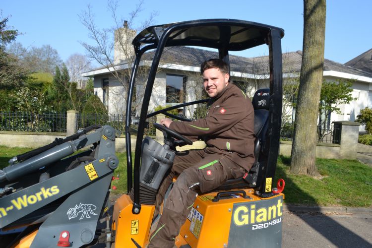 Sjors van Stiphout is als hovenier vers uit de schoolbanken. Sinds één jaar is hij werkzaam bij Den Engelse Hoveniers, dat gevestigd is in het Gelderse Beuningen. Hij werkt graag met de Tobroco-Giant D204SW, een kniklader van 1.100 kilo die het bedrijf sinds een halfjaar in zijn bezit heeft.