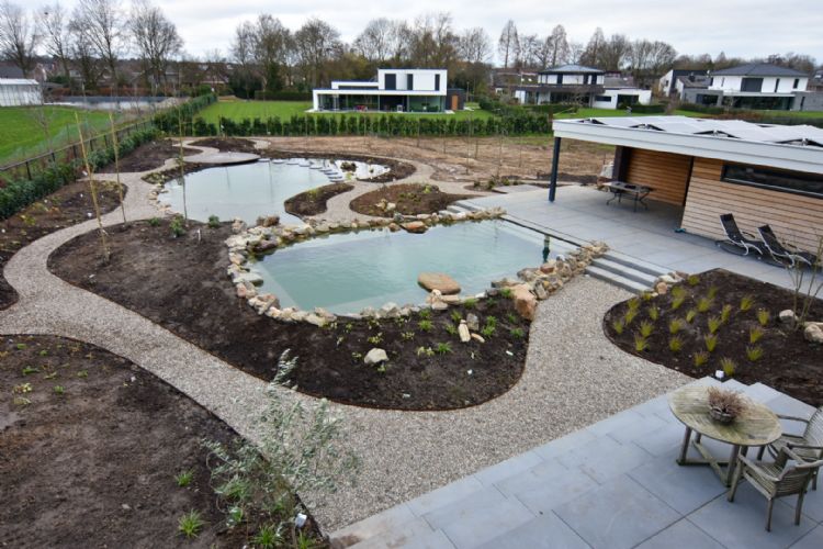 Tuinhelden kreeg bij deze opdracht eigenlijk te maken met twee overgangen: de overgang van een rechtlijnige, moderne woning met dito terras naar een natuurlijke tuin, en het hoogteverschil van 60 cm dat overwonnen moest worden. Voor de hoogte werden Carreau-trappen aangelegd; voor het benadrukken van de organische vormen en een duidelijke afscheiding werden er maaskeien gelegd langs de zwemvijver, die is aangelegd met Ecolan-folie.