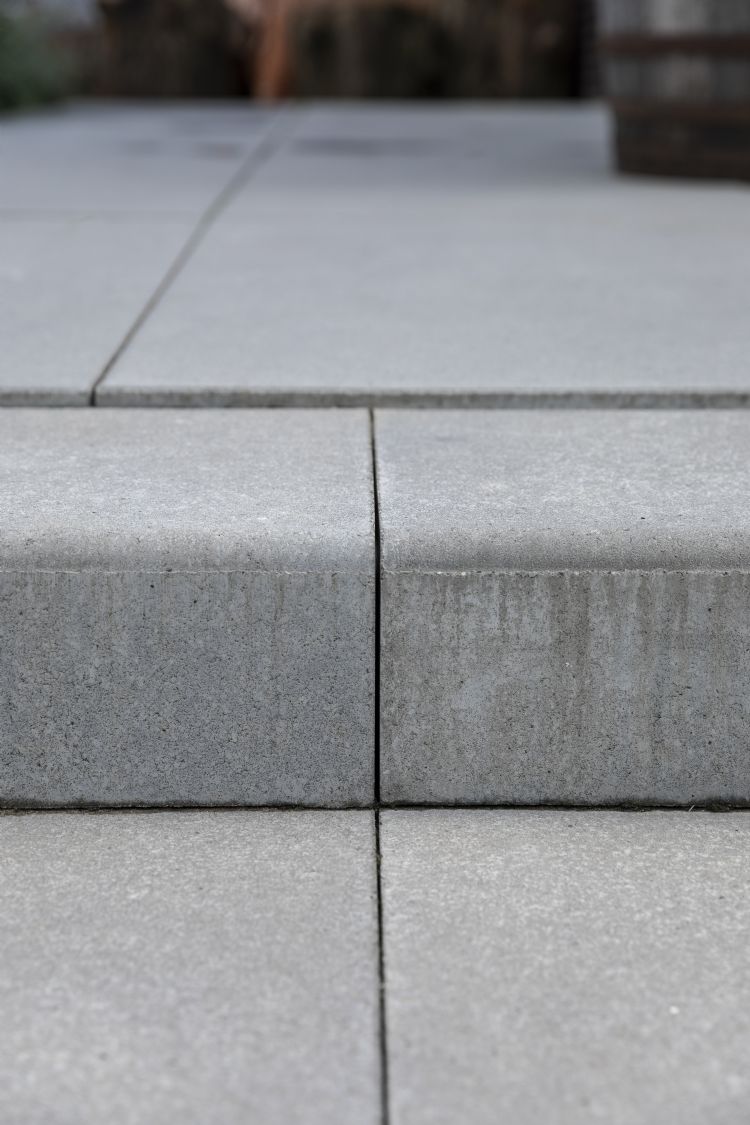 Voor de trappen koos Van Eijk voor de Megatrap Carreau van Ebema Stone&Style, kleurvariant Arduna. De treden zijn leverbaar in een lengte van 50 of 100 cm en er is keuze uit vijf kleurtinten. Het terras bestaat uit Megategels Carreau uit dezelfde lijn, met afmetingen van 120 bij 80 bij 6 cm. Tuinhelden kiest vaker voor Ebema Stone&Style: 'De betonnen producten zijn van een goede kwaliteit. De tegel is een vrij strak en modern uitgevoerd met een minimale facetrand, zodat er heel weinig ruimte tussen de tegels overblijft met smalle voegen.'