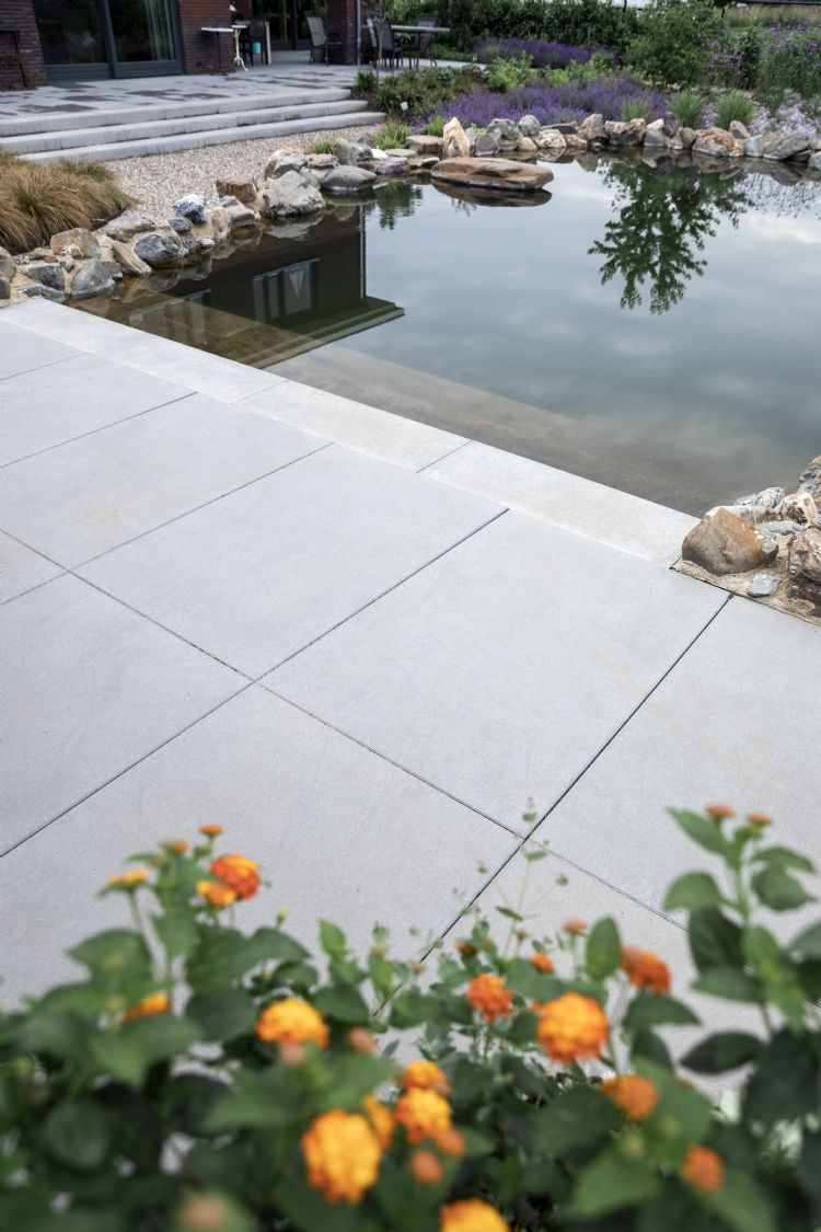 | | De tuin heeft een natuurlijke zwemvijver met betonnen traptreden van Ebema Stone&Style |