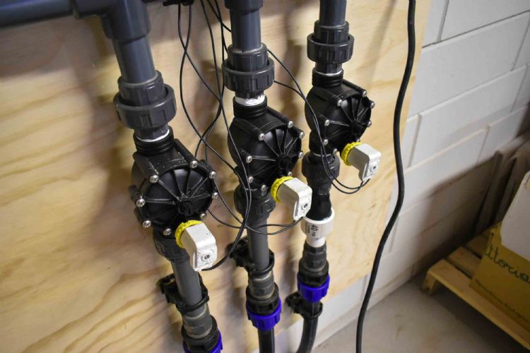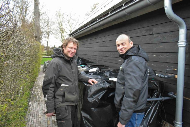De capaciteit van deze ionenwisselaar ligt maximaal op bijna 2,4 kubieke meter per uur. Dat is absoluut ontoereikend om de drie beregeningsgroepen afzonderlijk van voldoende beregeningswater te voorzien. Van Wijhe verklaart de keuze als volgt: 'Overdimensionering van de zuiveringsinstallatie is kostbaar en zeker niet duurzaam. Wij hebben in dit project een slimme oplossing bedacht.' En dat laten Van Gelder en Van Wijhe dus met veel enthousiasme zien. In de schaduw, achter de schuur van de opdrachtgever, staan drie geschakelde IBC-containers. Hierin wordt het gezuiverde water uit de ionenwisselaar rechtstreeks opgeslagen. Algenvorming in het schone water is uitgesloten, doordat de kunststof containers met een zwart doek zijn afgedekt. Verder zit er een vlotter in die de minimum- en maximumwaterstand van de buffer op peil houdt. Deze geeft een signaal aan de bronpomp en aan de ontijzeringsinstallatie om uit, respectievelijk in werking te treden. Naast een leiding voor de invoer loopt een andere kunststofleiding de schuur in. Die volgen we binnen verder.