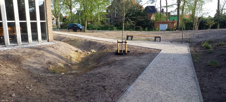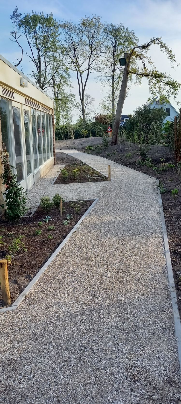 Toen Leersum vorig jaar werd geraakt door een valwind, stond de Johanneskerk in het hart van de storm. Op Google Maps is nog te zien hoe het ooit was, maar toen Bram van Schaffelaar er aan de slag ging, waren er alleen nog weggefreesde boomstammen en wat grasvakken te zien. Het kerkbestuur besloot de tuin te vernieuwen en ook voor een andere inrichting te kiezen. René Bosch van Bosch en Bosch tuin- en landschapsarchitecten tekende het ontwerp en koos voor de paden de halfverharding Achterhoeks Padvast.