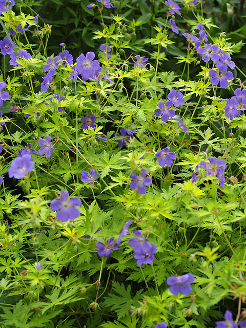 Voor de afwisseling: Geranium BLUE SUNRISE is een aanrader. In plaats van groene spreidende stengels heeft deze cultivar een fris geelgroen blad, waardoor hij ook niet-bloeiend een accent in de border is, leuk te combineren met andere bladplanten. Bij het uitlopen van het blad in het voorjaar oogt het blad zelf oranjegeel. Ondanks de lichte kleur van het blad wordt zonlicht getolereerd, maar hij doet het ook prima in de halfschaduw. De bloemkleur is eerst lilablauw, maar naarmate de nachten kouder worden, verandert die naar zuiver blauw. Eén van de ouders is 'Ann Folkard'; die heeft het DNA van het gele blad ingebracht.