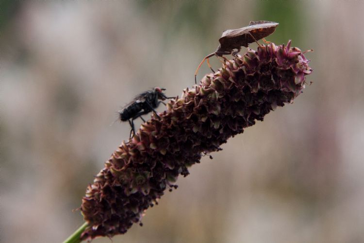 | | Rode pimpernel ontvangt vliegende korpsen. Sanguisorba menziesii met kevers |