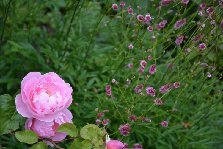 En dan kan het niet uitblijven: nog een variant. Omdat het kleurenpalet van Sanguisorba niet zo uitgebreid is, een roze bloeiende. Hij is als zaailing uit 'Tanna' gevonden, maar wordt wel iets hoger; 80 cm is vrij normaal en op vruchtbare grond haalt hij de meter. Maar hij is even ijl en subtiel in zijn uitstraling als zijn voorouder. Hij bloeit vaak iets vroeger dan het gros van dit geslacht. Hier is hij te zien in combinatie met een roze roos - prachtig, toch? Rozen zouden sowieso meer met vaste planten gecombineerd mogen worden, naar mijn idee. Zo kom je van die toch wat gedateerde perkjes af en kun je de vaak lelijk of kaal wordende onderkant meteen verbloemen. Je moet wel goed kijken welke vaste planten je daarvoor gebruikt, want rozen dulden niet alle buren.