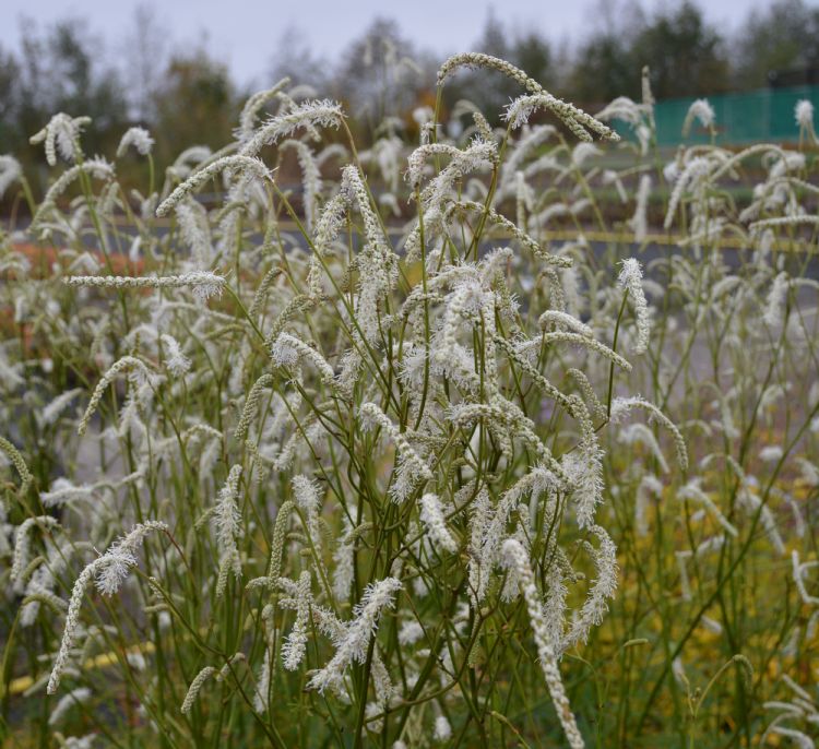Nummer negen is ook een serieus hoge plant, met weer zo'n pakkende naam, want hij blijft inderdaad in weer en wind rechtop staan. Ruim 2 meter is toch een flinke lengte om in één jaar te bereiken voor een vaste plant, maar hij krijgt het voor elkaar. Het is een selectie uit S. tenuifolia var. alba die veel mooier is dan de soort. Door zijn hangende aren en kleur is het een sierlijke toevoeging aan de border. Met een beetje geluk krijg je na een droge zomer nog een oranje herfstkleur van het blad. In een Duits vergelijkend onderzoek werd de cultivar bekroond met drie sterren, met andere woorden 'uitmuntend'!