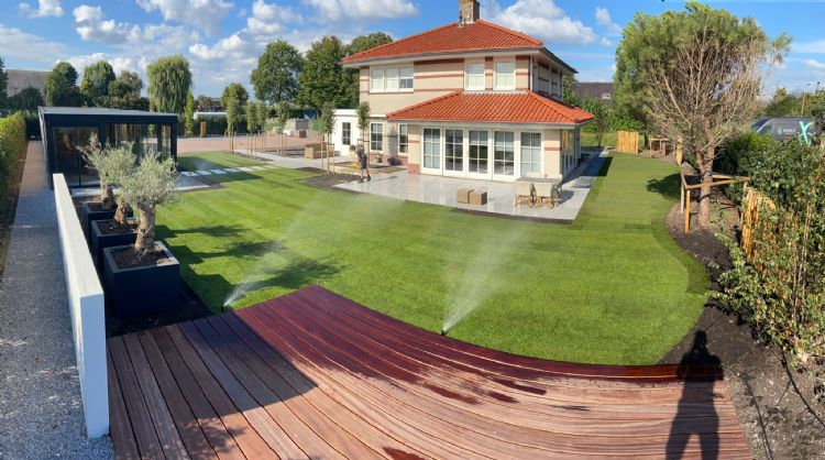 Van Genderen wil graag een mooi en uniek project belichten dat onlangs is afgerond. 'We hebben afgelopen jaar een moderne villatuin van 1800 m2 bij een vrijstaand huis in Zevenhuizen aangelegd. In drie à vier weken maakten we een groot bijgebouw van 6 meter breed en 17 meter lang dat er aan vast zat. In één gebouw werd een veranda gecombineerd met een keuken annex bar en een carport gerealiseerd. De veranda werd helemaal geïsoleerd en er werden heaters en inbouwverlichting aangebracht. Ook hebben we glazen schuifwanden toegepast. Het gehele bouwwerk is door middel van een schroeffundering geplaatst. Voor de constructie is lariks gebruikt, voor de gevel- en muurbekleding fraké.' De tuinontwerper kreeg de vraag van de klant om de hele tuin op de schop te nemen. Ook wilde de klant graag extra bergruimte en een veranda om met de hele familie gebruik van te maken. 'Er was een behoorlijke overkapping nodig. Ook zag ik het nut van een carport in, omdat er een grote oprit ligt. Dit alles heb ik in één gebouw samengevoegd. Daarnaast hadden we ook een ruimte nodig waarin de techniek voor de tuin kon worden ondergebracht, zoals beregening en belichting. Dat konden we ook mooi in de berging kwijt. Zo is het grote gebouw ontstaan. Daarnaast heb ik de tuin mee ontworpen in 3D. Al met al was het een flinke investering; om er een beeld bij te krijgen, heb ik de mensen een 3D-presentatie aangeboden. Zo kon je goed zien hoe we het hadden bedacht en hoe het uiteindelijk is geworden. Dat liep echt naadloos in elkaar over.'