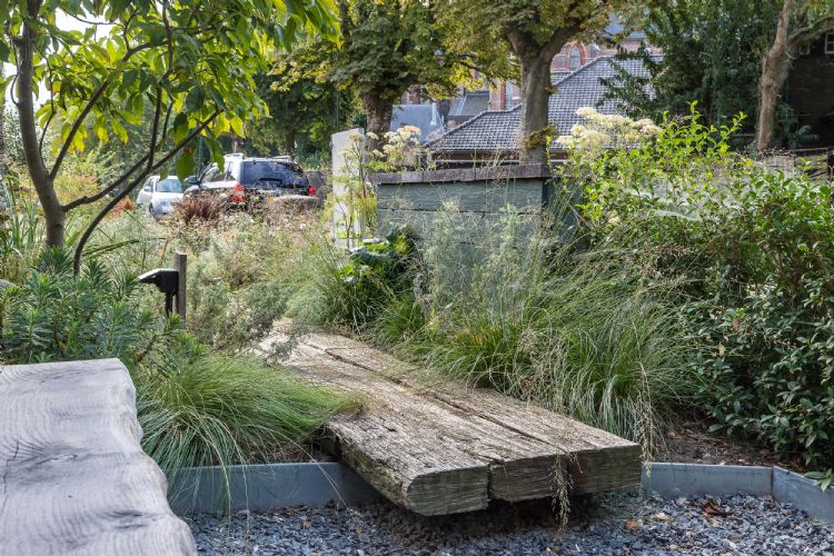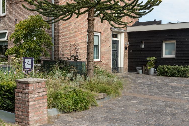 Tuinstudio Tom heeft een groene voortuin gerealiseerd die volgens ontwerper Tom Poppelaars elk seizoen garant staat voor verrassingen. De beplanting, geleverd door Kwekerij & Plantencentrum Schonenberg, bestaat voor de helft uit inheemse soorten. De zinken randen zijn geleverd door Adezz, de grondverbetering is uitgevoerd door Den Ouden Groep.
