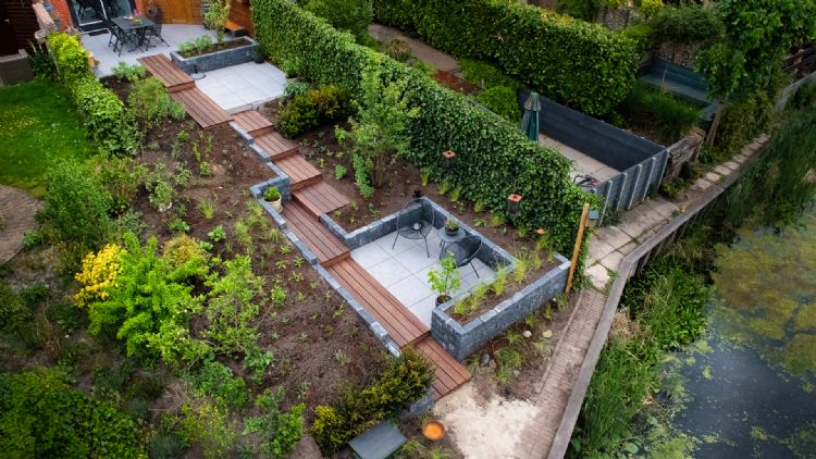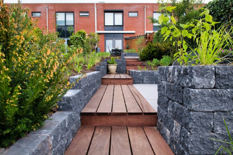 Het overbruggen van een hoogteverschil van 150cm. Dit vormde voor Mirco Bakker van Hoveniersbedrijf Marco Bakker de belangrijkste uitdaging bij het realiseren van een tuin met uitzicht op het water in Assen. Om zijn doel te bereiken werkte de ontwerper met het hout van Awood, de beplanting van GreenSales en de terrastegels van Buiter Beton.