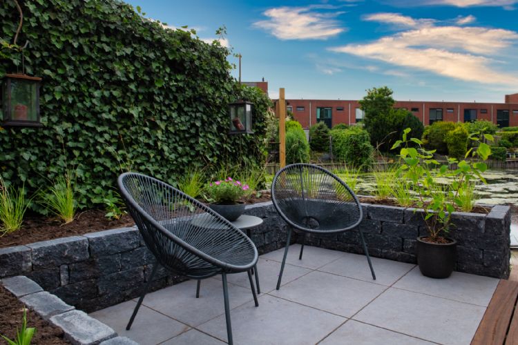 Geoceramica Belgian Grey (tegels) van Buiter Beton, Padouk Gevelparket (hout) van Awood, beplanting van GreenSales |