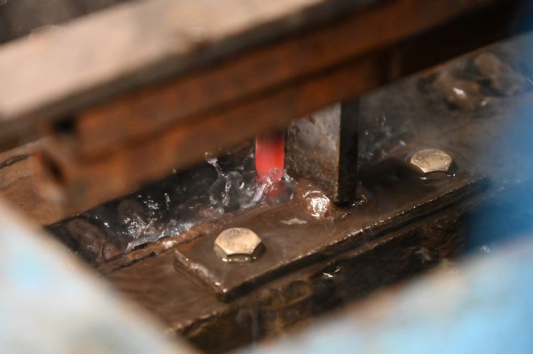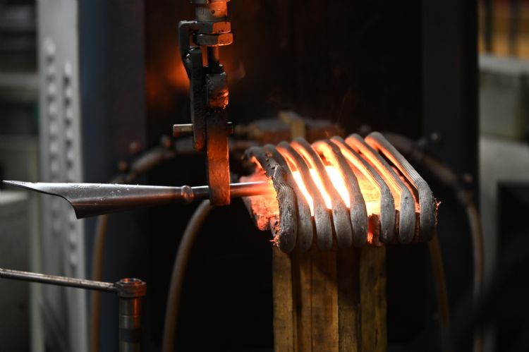 Na het lassen gaan het blad en de stift in de inductieoven om tot 1200 graden verhit te worden. De inductieoven is klein en verhit alleen het blad en de stift. Hierdoor wordt veel energie bespaard.