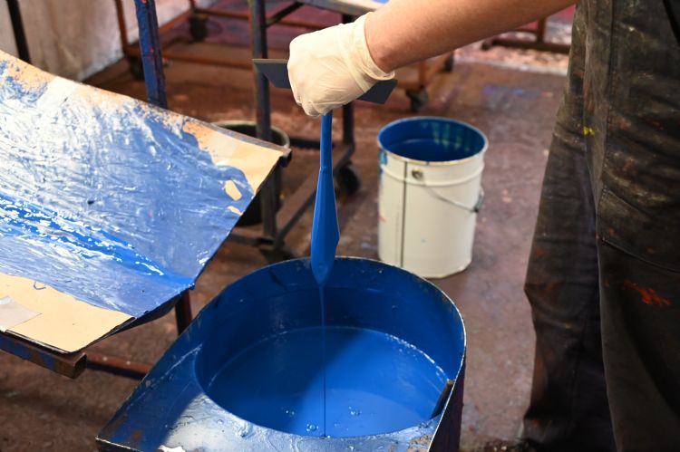 De verf is volledig op waterbasis en moet daarom minimaal 24 uur uitharden. Verfresten druppelen via een kartonnen trechter terug de verfemmer in.