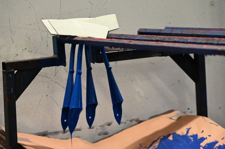Het smeedwerk zit erop; tijd voor een verfbadje. Hierin wordt het schoffelhuisje in de karakteristieke blauwe kleur geverfd.