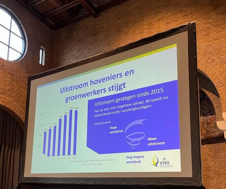 De explosieve groei van de groensector is positief, maar het heeft wel een schaduwzijde zo waarschuwt Roebroeck. 'We moeten oppassen voor de negatieve spiraal, dat door stijgende werkdruk meer mensen uitvallen en zo de werkdruk weer verder stijgt.' Een ontwikkeling die bijvoorbeeld zichtbaar is onder verpleegkundigen. Roebroeck laat hierbij cijfers zien waaruit blijkt dat de uitstroom van hoveniers en groenwerkers in de sector de afgelopen jaren stijgt.