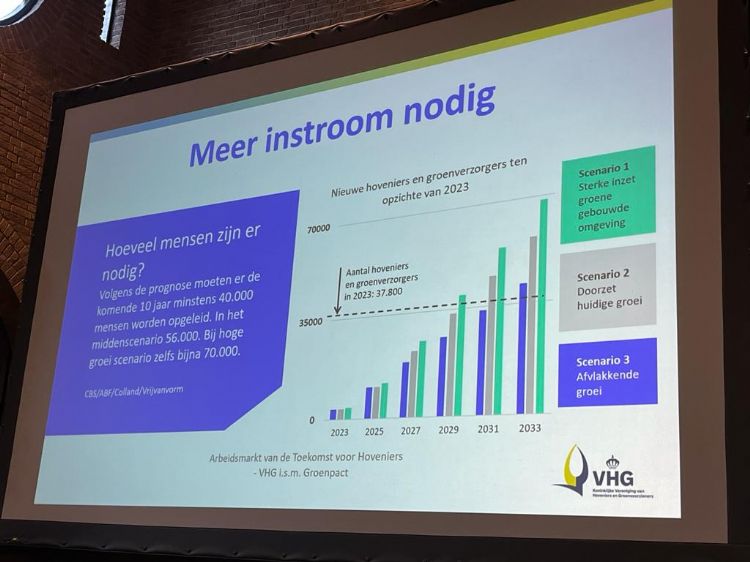 Het personeelstekort lost de VHG niet op aan de vergadertafel in Ede, daarom trekt de branchevereniging de regio in. Laura Roebroeck van Groenpact en beleidsmedewerker Jeroen Zijlmans van VHG gaven tijdens de eerste inhoudelijke presentatie wat cijfers over de arbeidsmarkt. Zijlmans: 'Er zijn weinig sectoren die zo'n explosieve groei hebben gekend als de groensector. Zo hebben we alleen al 1500 extra mensen op jaarbasis nodig, bovenop vervanging door uitstroom.'