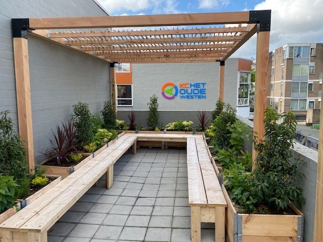 Voor KC 't Oude Westen realiseerde hovenier Toon Alleman van Toon Tuinen samen met Fleur Menke van Opfleuren een nieuwe daktuin. Bestaande uit pergola's, robuuste plantenbakken met diverse soorten beplanting en matchende bankjes een mooi geheel. Een bijzonder element is het schapenhekje in de pergola.