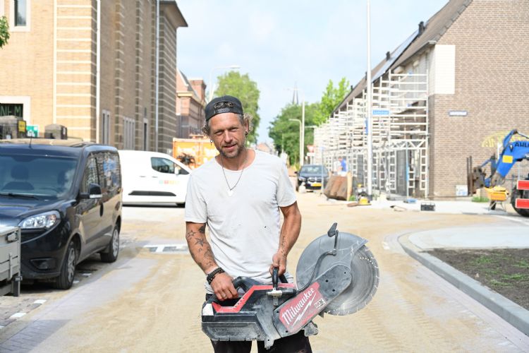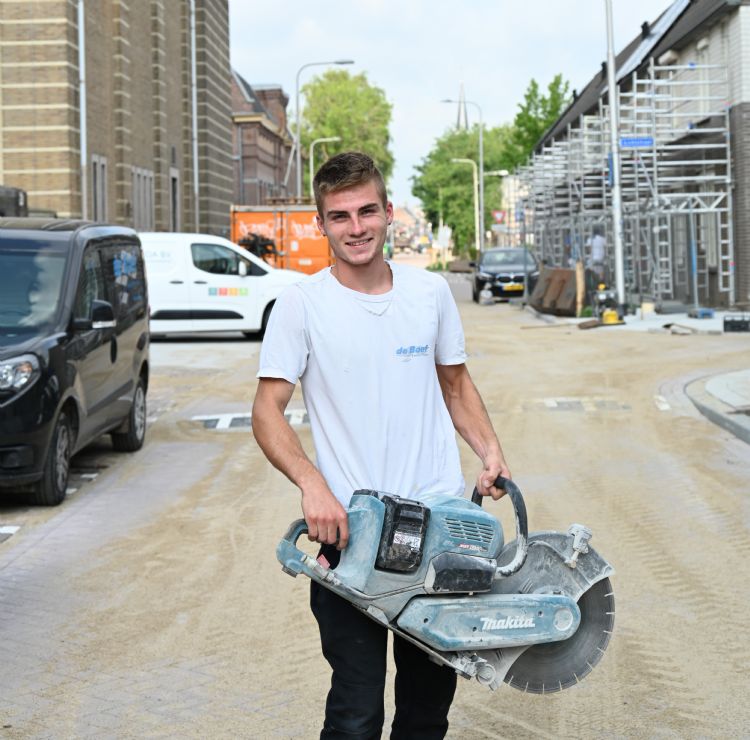 Iedere hovenier en stratenmaker heeft wel een doorslijper in zijn bus liggen. Maar waar bij heggenscharen en bosmaaiers de accu inmiddels standaard is, lijkt dat bij doorslijpers veel minder het geval te zijn. Stratenmaker Patrick Ippel van De Boef kent die accumachines van een vriend van hem die hovenier is. 'Leuk, zo'n machientje, als je een betonbandje voor in de tuin wilt doorslijpen, maar niet voor ons. Wij werken met slijpschijven van 35 cm of soms nog groter.' Directeur Arjan de Boef is ronduit sceptisch wanneer ik hem vraag de slijpers te testen: 'Superleuk dat je ons vraagt, maar ik moet het allemaal nog zien.'