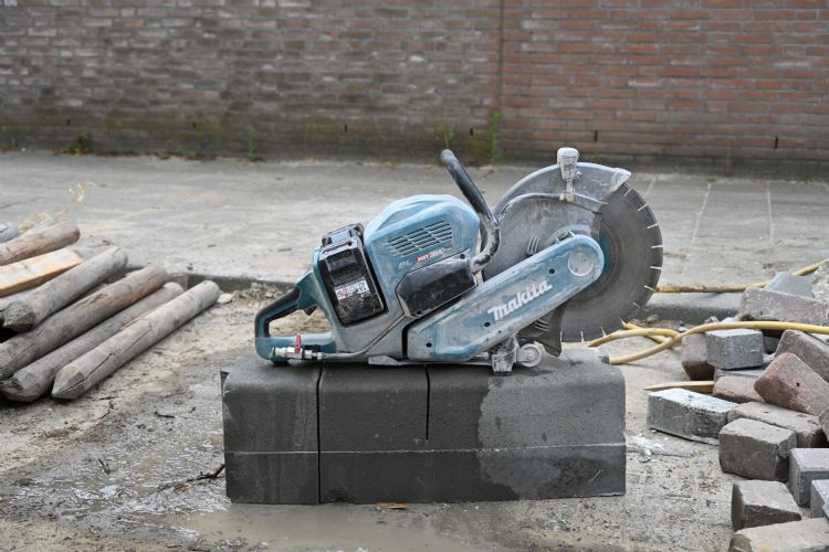 Bij Makita betrof de test de CE001GL402-accudoorslijper, waarin een schijf gemonteerd kan worden van maximaal 355 mm. Deze machine draait in onbelaste toestand 5.300 rpm. Arjen Peeters, productmanager bij Makita, geeft aan dat het XGT-platform waarvan deze machine gebruikmaakt uniek is. 'Doordat elke machine een speciaal ontworpen controller heeft, en dankzij de digitale communicatie tussen de accu en de machine, presteren ze altijd op maximaal vermogen', vertelt Peters. 'Daarnaast zijn de accu's op het XGT-platform uitwisselbaar met inmiddels 150 andere machines. De geteste CE001GL402-accudoorslijper werkt op 2 x 40 volt en bij vier accu's is de maximale capaciteit 8,0 Ah. Deze Makita heeft een slijpdiepte van 127 mm en een vermogen van 3,6 kW en is universeel inzetbaar bij projecten van hoveniers, stratenmakers en in de wegenbouw. Qua snijsnelheid is deze accudoorslijper vergelijkbaar met de meeste benzinemotorslijpers.