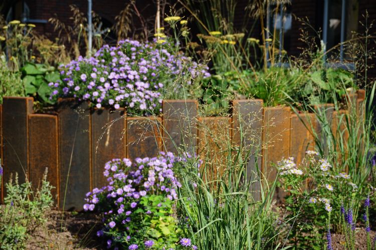 Prairiebeplanting (samengesteld door Tuinstudio Tom) Cortenstalen elementen door Adezz Betonstroken van Schellevis Gebakken stenen van Wienerberger Steenkorf-tuinafscheiding door tuineigenaar samengesteld van bakstenen. De stenen waren over van de bouw van het woonhuis