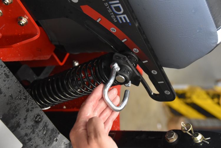 Eerst wordt me gedemonstreerd hoe je de vlakheid van het maaidek eenvoudig kunt verstellen met twee stelbouten. Ook het handmatig instellen van de hoogte van het maaidek wordt toegelicht. Dat gebeurt met een degelijke pen-en-gatverstelling, rechts naast het voetplateau. Het maaidek kan nooit verder zakken dan de daarmee ingestelde waarde. Deze pen is magnetisch en trilt daardoor tijdens het transport en het maaien niet uit het gat. Een handigheidje is dat je het maaidek met een mulchkit iets hoger kunt zetten aan de achterzijde. Daardoor verlaat het maaisel het maaidek dan net iets sneller en functioneert het enigszins als een achterlossende maaier. Dit bespaart ook weer elektriciteit. Het maaidek hef je met een pedaal voor je rechtervoet, maar optioneel is er ook een elektrische heffunctie mogelijk. In beide situaties zorgt mechanisch automatisch voor de vergrendeling. Een kunststof trede maakt me een veilige opstap via het gladde dek naar de comfortabele Grammer-stoel mogelijk.