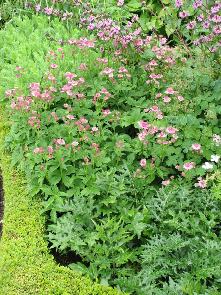Deze superster wordt ook onder de foutieve naam 'White Giant' verhandeld. Het is een versie van de bekende 'Buckland', maar met grotere bloemen. Ik zag hem eens gecombineerd met een dubbele roze roos, heel mooi. Het is sowieso een goed idee om die twee te combineren, want ze houden van dezelfde grondsoort. Rozen houden niet van wortelconcurrentie. Daarom is het raadzaam om vaste planten te combineren die geen worteluitlopers maken, maar uit de pol groeien. Gelukkig doet Astrantia dat. Daarnaast krijg je een mooi beeld als je duidelijke bloemen afwisselt met subtielere bloemvormen, zoals Zeeuws knoopje (ik blijf volhouden ...).