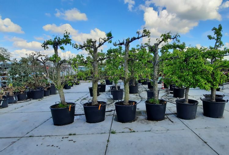 'Dit zijn oude gaardbomen, die we "fruitbomen oude knot" noemen. Hier is steeds meer vraag naar voor tuinen. Vaak zijn het oude productiebomen, die bij kwekers gerooid zijn omdat de maximale productiecapaciteit niet meer wordt gehaald. Het voordeel van een oude fruitboom is dat die een bepaald model heeft. Deze bomen worden vaak compact gehouden door snoei; ze bestaan dan uit een hoofdstam met een paar zware zijarmen, zodat er voldoende licht en lucht in de boom komt. Het is de bedoeling dat de boom deze vorm houdt. Wanneer wij ze verkopen, zijn ze 2,5 tot 3 meter hoog. Peren, appels, pruimen, kersen, het zijn bomen uit Nederlandse gaarden, die overigens nog wel vrucht geven.'