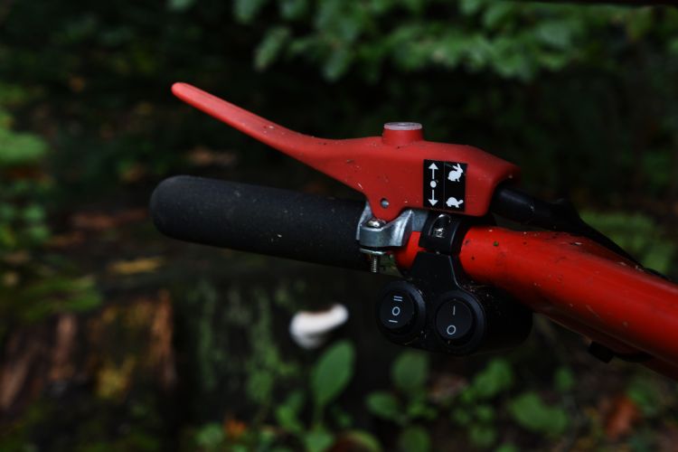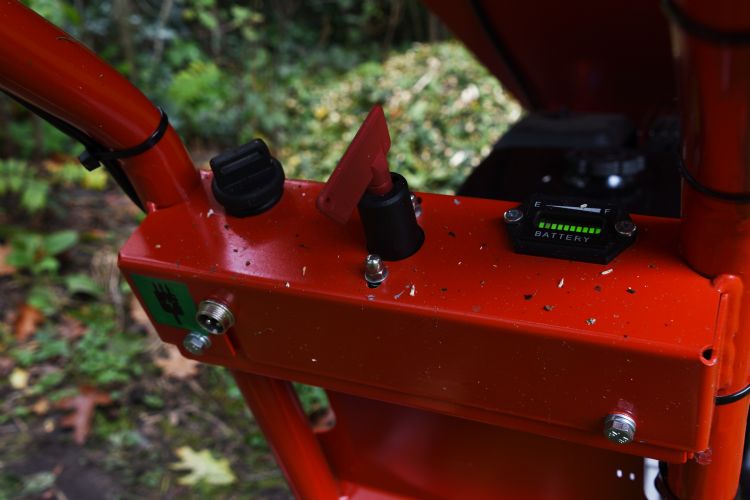 Zandijk: 'We nemen hem niet mee voor elke tak, maar als het nodig is, gaat hij mee op onze aanhanger voor snipperwerk in particuliere tuinen. Omdat hij zelfrijdend, vrij smal en wendbaar is, kun je hem gemakkelijk naar de werkplek rijden. Het sturen verloopt soepel met de stuurbeugel die onder de invoer is gemonteerd. Op die stuurbeugel bepaal je ook de gewenste rijsnelheid en kun je de resterende accucapaciteit zien. En die is in onze situatie toereikend. Alleen als het nodig is, laden we bij terugkomst in onze loods de twee 12V-accu's op. Dat duurt circa vierenhalf uur.'