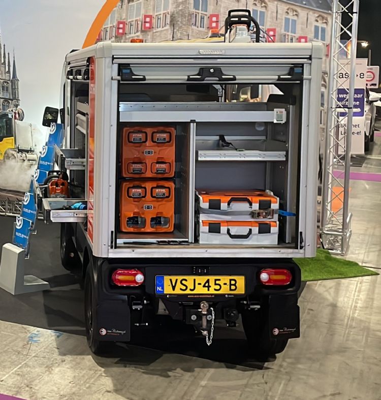'De gemiddelde gebruiker rijdt op een dag maximaal 100 kilometer', weet Harkes. 'Met het grootste accupakket van 21 kWh kun je de helft gebruiken om te rijden en de andere helft voor het opladen van de machines. De afstanden zijn beperkt bij het stedelijk groenonderhoud, dus er is elke dag stroom over. 's Avonds gaan de wagens weer aan de oplader. Inmiddels hebben we meerdere demo's gegeven en de reacties zijn enthousiast. Het mooie van het systeem van Bott is dat alles precies zo gemaakt kan worden als je het wilt hebben: dit iets groter, dat iets smaller, het kan allemaal. Het is modulair opgebouwd, waardoor er veel mogelijk is.' 'En het is heel sterk', zo vult Van Diepeningen aan. 'Er zit tien jaar garantie op de inrichting. Als je er netjes mee omgaat, kan die je hele carrière mee. Wie van gereedschap houdt en van STIHL, wil dit. Het ziet er geweldig uit. Het is voor ons als bouwer ook fijn dat de bak van Goupil kaarsrechte wanden heeft en ook nog eens naar wens is in te richten. Dat kan bij wijze van spreken met drie roldeuren, maar het kan ook helemaal anders. Zo kunnen we samen iets moois bouwen.' Harkes besluit: 'Wij kunnen natuurlijk prima laten zien hoe een Goupil eruitziet en wat je ermee kunt. Maar zo, door onze samenwerking met Bott en STIHL, kan de vakman het voor zich zien. Hij ziet gereedschappen waar hij dagelijks mee werkt efficiënt en veilig opgeborgen en het laden is ook nog eens gegarandeerd. Voor ons als Van Blitterswijk Eco-Mobiliteit heeft dat een enorme meerwaarde.'