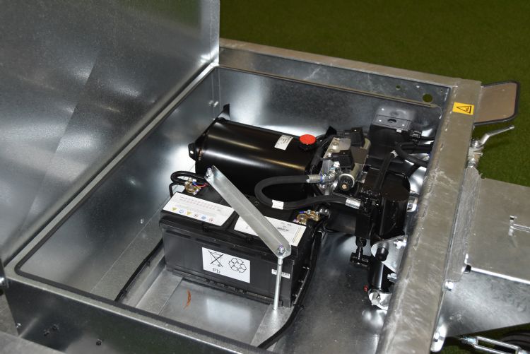 Uiteraard heeft de TwinTrailer ook een 'vette' hefcilinder om de bak achterwaarts te kippen. Die geeft de bak een maximale hellingshoek van 55 graden. De bediening hiervan is, net zoals bij de kleine cilinder, elektrohydraulisch. De omschakeling gebeurt eenvoudig binnen de seconde door een driewegkraan in de juiste richting te plaatsen. Een door accu aangedreven elektromotor drijft hierbij de hydrauliekpomp aan. TwinTech ontwikkelde op de TwinTrailer zelf een ingebouwde water- en shockproof lader, waarmee de accu eenvoudig op netstroom is op te laden. Deze innovatie is op het gebied van aanhangwagens enige in zijn soort. Het product is namelijk internationaal gepatenteerd. Natuurlijk moet je ook weleens een zware, 'lastige' last aan boord zien te halen. Denk aan een machine waarin je geen beweging kunt krijgen, of een dikke boomstam. Ook daar dacht TwinTech aan en daarvoor heeft de TwinTrailer optioneel een vaste lier met staalkabel op de trekdissel staan. Om deze te gebruiken, moet je eerst je eigen spierbundels aanspreken.