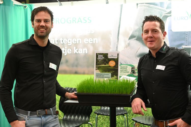 Op de stand van DSV duimen Steven Wiersma en Thijs Schoenmakers volop voor hun nieuwe schaduwgazonmengsel Silhouette. Het nieuwe mengsel was te vinden als innovatie in de Tunnel van de Toekomst maar werd helaas niet vereerd met een podiumplek.