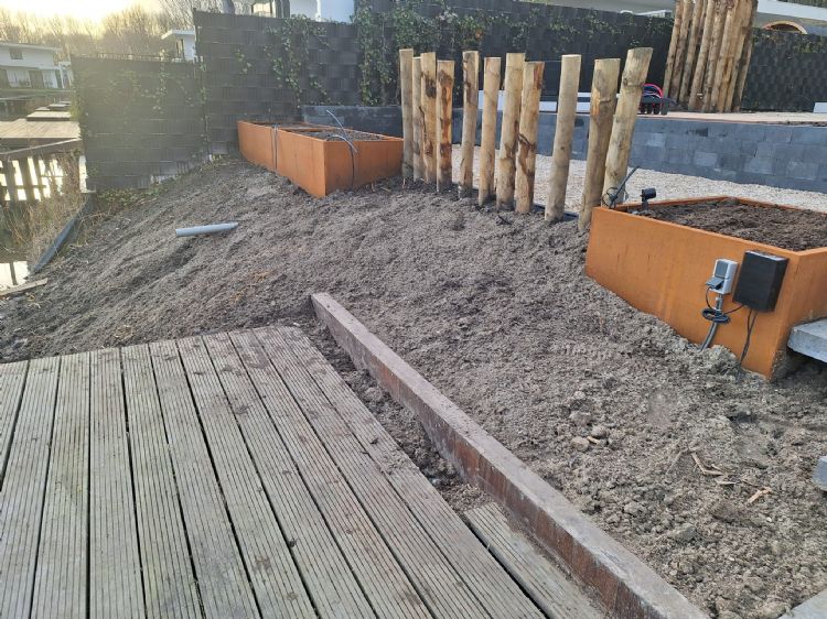'De uitstraling en de mooie manier waarop je de cortenstalen plantenbakken van Adezz kunt belichten, maakt dat we ze steeds weer inzetten in de tuinen die we aanleggen,' vertelt werkvoorbereider Peter Moelee. Moelee is bij het Harderwijkse bedrijf Steengoed! Hoveniers verantwoordelijk voor de inkoop en werkvoorbereiding. 'Na aanleg van één tuin wilden diverse huiseigenaren op Harderwold Villa Resort graag met ons in zee voor aanleg en onderhoud. Het gaat om zo'n 60 procent van alle villa's in het park. Gelukkig hebben we wat extra handjes via jongeren die één dag studeren en vier dagen bij ons willen werken. Maar onze agenda's zijn tot de zomervakantie helemaal volgeboekt.' Moelee vermoedt dat Steengoed! Hoveniers hiervoor zo vaak benaderd wordt, omdat zijn bedrijf door de verkoper van de villa's naar voren is geschoven. Steengoed! Hoveniers bestaat 25 jaar en is opgericht door eigenaar Nico Visser. 'Omdat we vooral luxe tuinen aanleggen, merken we met name groei in economisch goede tijden,' legt Moelee uit. 'Ook nu maken we een groei door. Er is belangstelling voor villa's die verhuurd kunnen worden met tuinen die een mooie uitstraling hebben.'