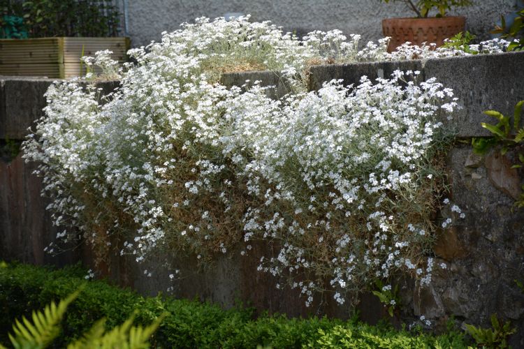 3. Cerastium tomentosum Een bodembedekker of, zoals je wilt, een muurtjesbedekker met een hoog retrogehalte. In de jaren vijftig tot zeventig van de vorige eeuw waren ze erg populair, maar zijn zachtjesaan verdwenen. Daarom opnieuw onder de aandacht, want het is een reuze makkelijke plant die vroeg bloeit, verwant is aan onze inheemse hoornbloem en zodoende dus ook onze insecten kan bedienen in dit vroege jaargetij. Liefst een zo arm mogelijke, zonnige plek. Kan tussen een stapelmuurtje.