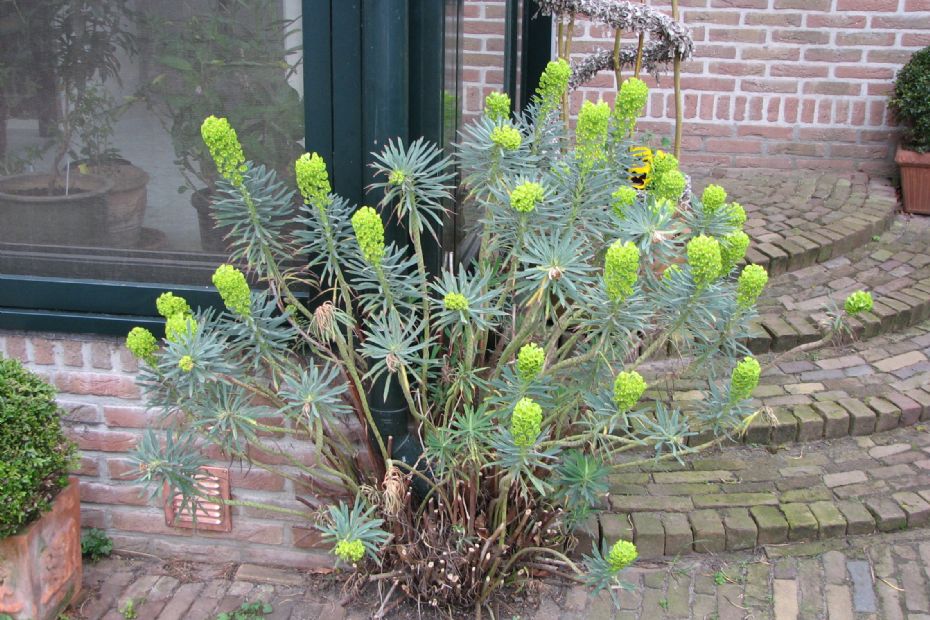 Niet het mooiste exemplaar van deze Euphorbia, maar op de foto is duidelijk te zien dat deze plant hier al een paar jaar staat. Tussen de stenen van een entree en tegen de hoek van een muur; een beroerdere plek is haast niet denkbaar. Toch doet hij het prima. Er zijn meer soorten Euphorbia die veel droogte kunnen hebben, maar let op: niet allemaal. Euphorbia palustris wil heel graag natte voeten, zoals de naam al doet vermoeden. Probeer eens Euphorbia schillingii; wordt wel 90 centimeter hoog met fris geelgroene bloem die van juni tot september bloeit. Kun je deze niet vinden? Euphorbia cornigera lijkt erop, komen beide uit het Himalayagebergte en zijn dus keiwinterhard. Maar de onvolprezen Euphorbia charasias-cultivars blijven ook nog steeds de moeite waard.