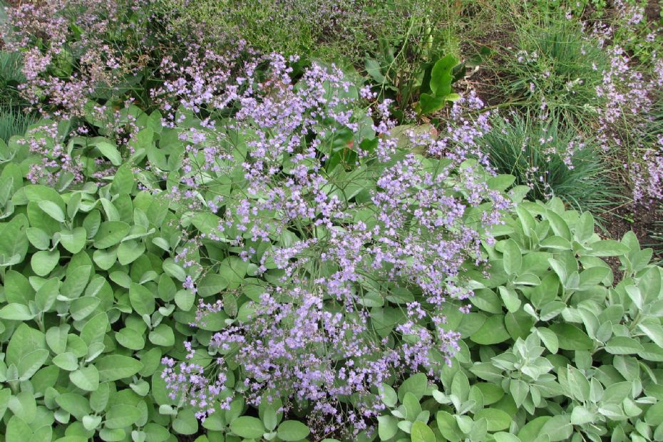 Lamsoor moet echt op heel arme grond staan. Als hij het te goed heeft, vallen de bloemen uit elkaar. Op de foto zie je dat een slimme ontwerper de combinatie met Salvia officinalis 'Berggarten' heeft gemaakt. Die voorkomt het omvallen. Bovendien is de combinatie sowieso goed gevonden; een fijn bloemetje met wat grover blad. Limonium is in Nederland inheems aan de kust. Het bladrozet ligt met het grote bladeren op de grond. De bloem steekt er met zo'n 30 à 40 centimeter lange stelen bovenuit. Er zijn maar weinig planten die deze structuur hebben.